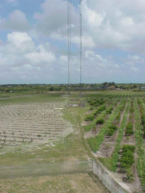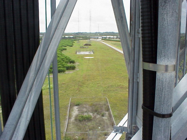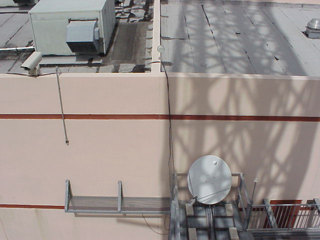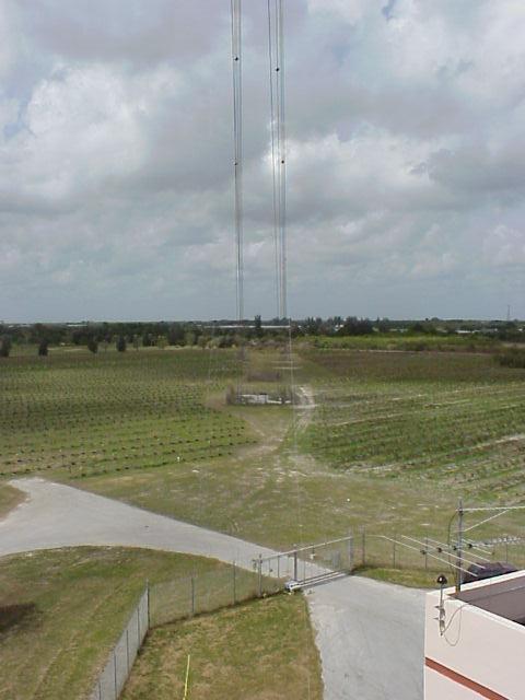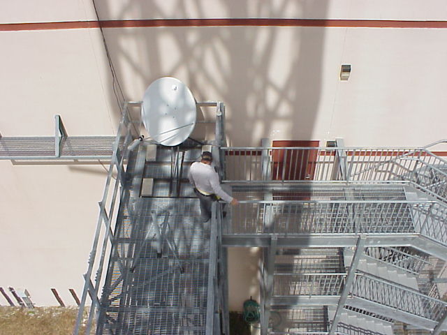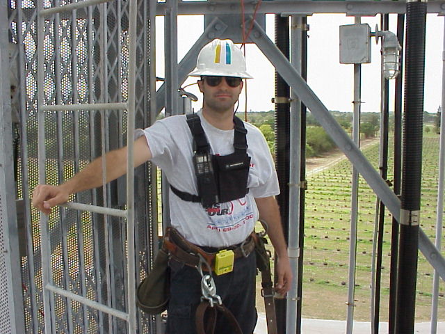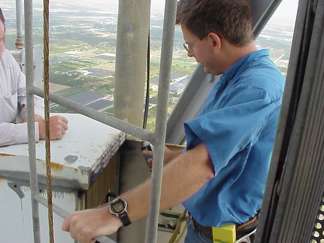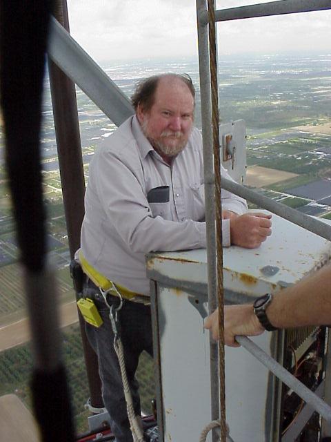 Here are some pictures from our tower trip on February 25, 2001. We replaced the temporary 18 watt Power Amp (PA) with the regular 100 watt model. The power was set to 60 watts. This should help people on the fringes hear the system. We also put primer and paint on the rapidly rusting cabinet. We'll need to replace it soon with a fully stainless or aluminum cabinet. John, KU4GY, the 147.000 trustee, was the ground crew. Thanks also to John, KF4ACN for repairing the PA. George, WT4X, at the front of the repeater cabinet. 1400' up the tower.
