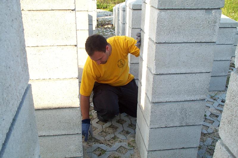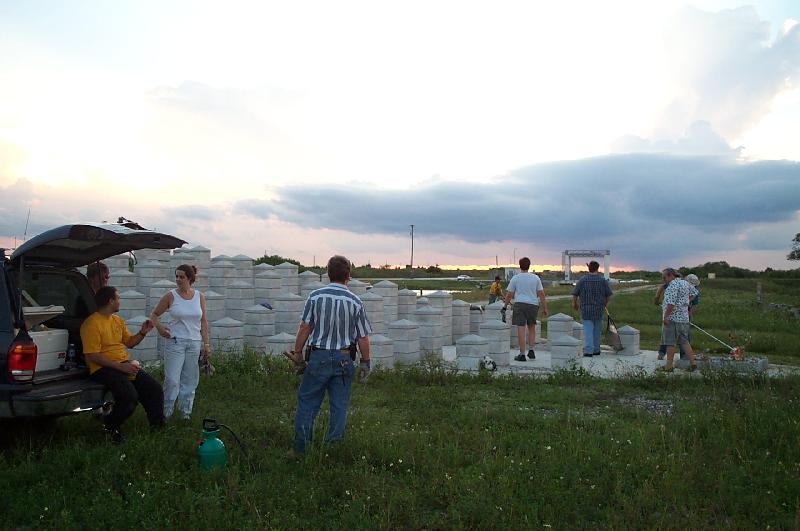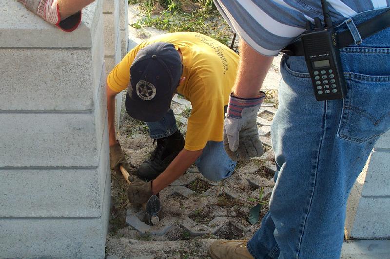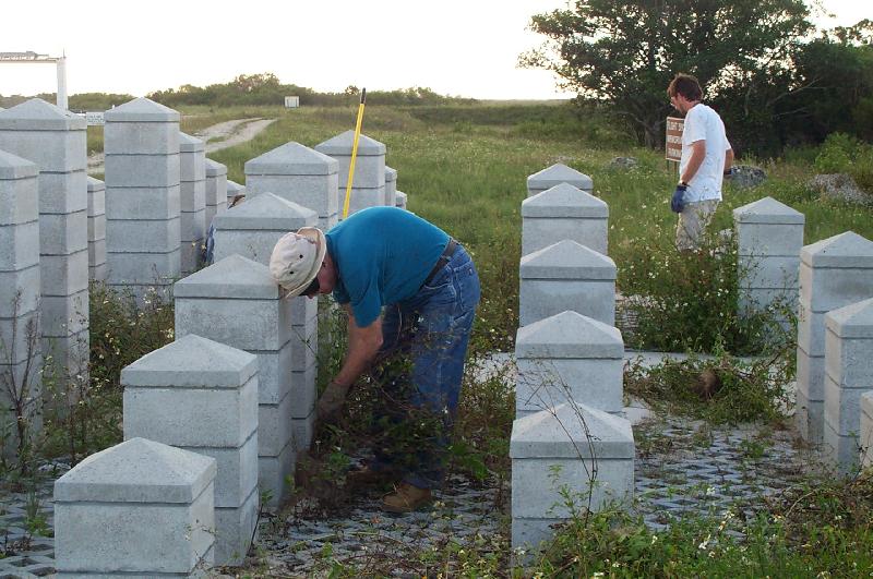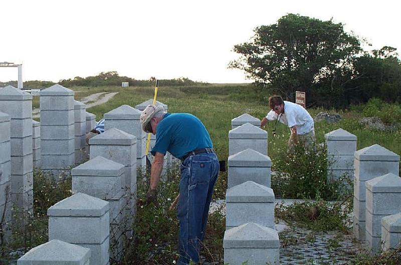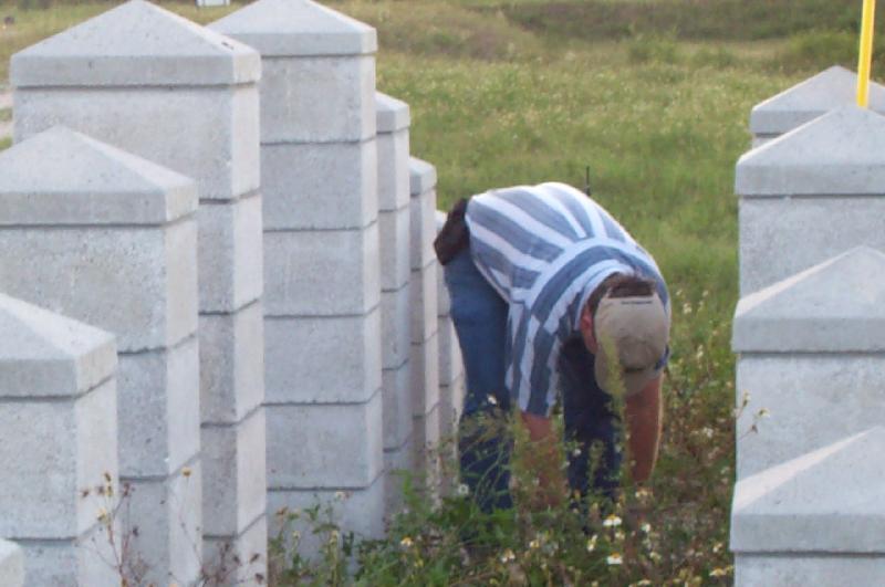 Now the work begins: What we did: Pulled weeds, killed ant piles, pulled out root balls from the larger weeds, applied weed killer, cut the grass around the memorial, swept the cement, refilled any missing sand, re-leveled some of the bricks that had been moved by the weed roots, piled up the trash. There was very little man-made trash here. Just natural weed growth. This sort of project will need to be done at least twice a year. If the weeds are allowed to grow any more than that, the bricks between the columns will be upset by the roots. Would your group like to clean this site also? Instructions on how we did it and advice here.
