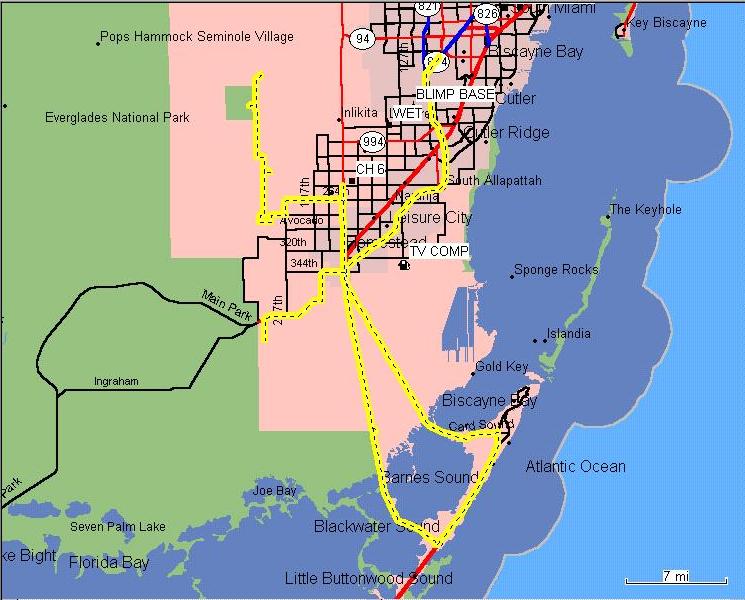 | On September 1, 2001, a group of 10 active hams toured some locations in South Dade. Part scouting trip, part hike, part educational, part history documentation. While it was a lot of fun, it also gives us information about locations around Miami-Dade where we might be called to help. I really need help explaining this stuff, so please try to describe the things we found and drop me an e-mail. I know the 'old timers' and my fellow natives know a lot of stuff about this area. Here's a map of our trip: