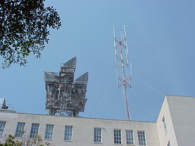Here are the antennas on the roof. On the left are some of the few remaining "cornucopia" style microwave dishes, 4-6 GHz. These used to link long distance switches before the days of fiber. The tower on the right is 2-way radio, maybe from the days of the first mobile telephones and pagers.
