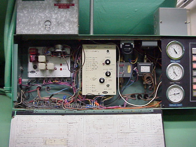 The inside of one chiller control panel.